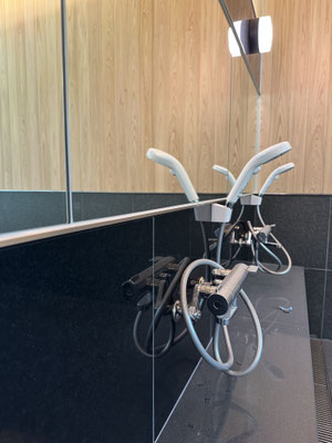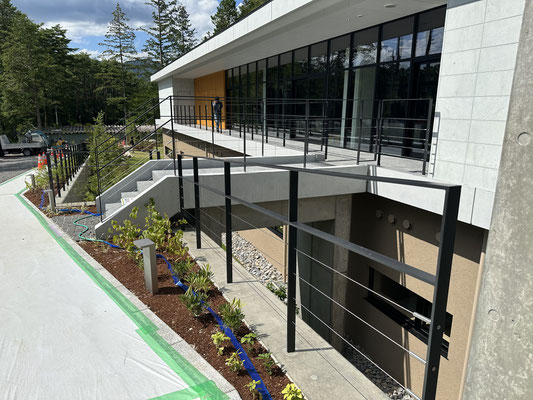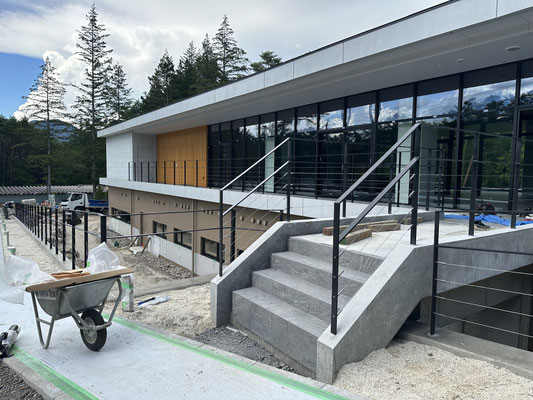 自然豊かな長野県の木曽地域に新設された施設工事にて、テラス手摺や屋内階段手摺、浴室壁面見切り材やグレーチングなど。