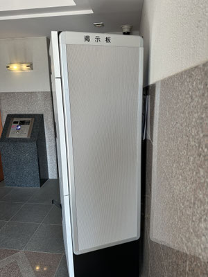 お客様からのご要望で、宅配ボックスの側面には、ボックスの幅に合わせた特注サイズの掲示板も取付けております。
